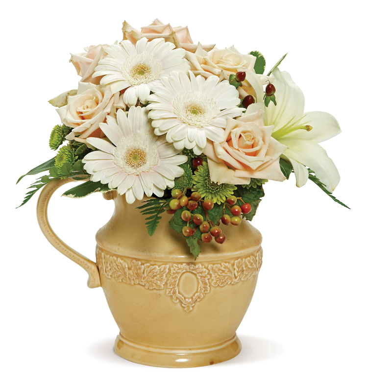 Pale blooms in delicate- tinted shades of white and peach ? accented with hypericum berries- and displayed in a decorative container ? create a pretty display that would make a lovely gift for a favorite friend- mother or grandmother. Container may vary.