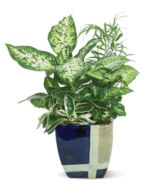 A selection of green houseplants in an artistic ceramic pot presents an interesting selection of textures and leaf shapes- and will be a pleasant addition to any room. A great way to perk up an office- or as a gift for any occasion. Exact pot may vary.