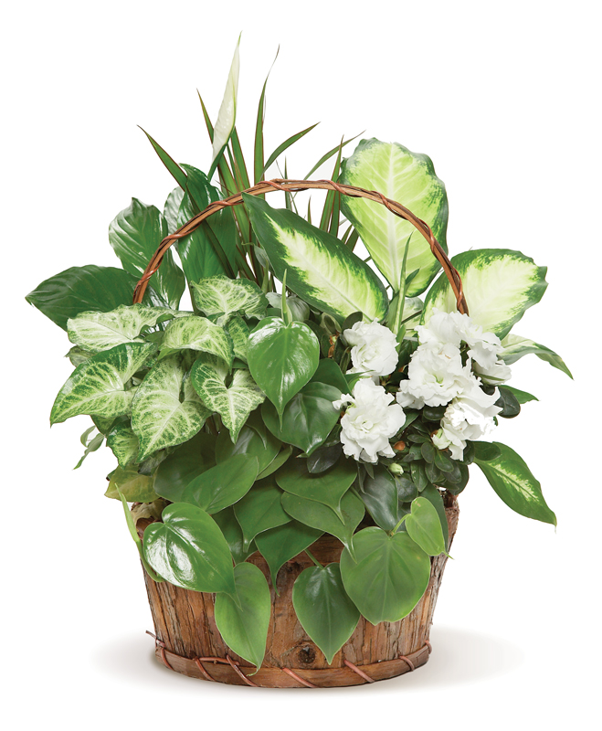 The frilly blossoms of a petite azalea bush mingle with a selection of popular houseplants in this charming planter basket ? a great gift for any occasion. Send one to a business associate with best wishes- to a family member- or to a special friend.