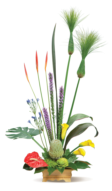 This bold mix of exotic tropical elements- greenery and flowers soars upwards in a dramatic arrangement that will capture everyone?s attention! An interesting and long-lasting floral display that will brighten any room.