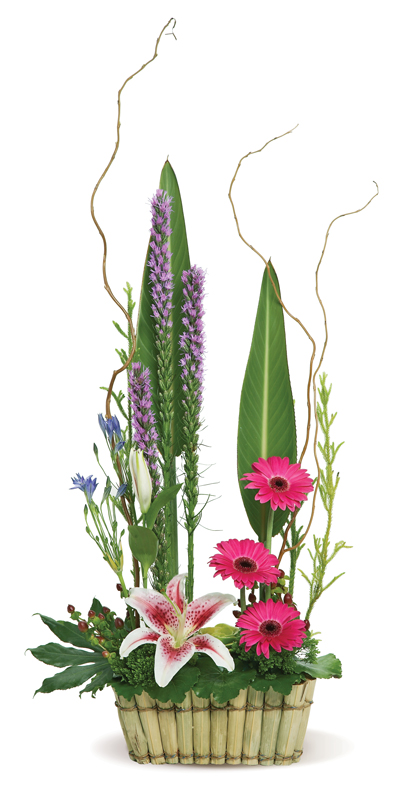 Happy days will be here again- when you send someone this cheerful display of hot pink gerberas- speckled lilies and more- arranged in a rustic container. A darling gift for a mother- grandmother or devoted friend.