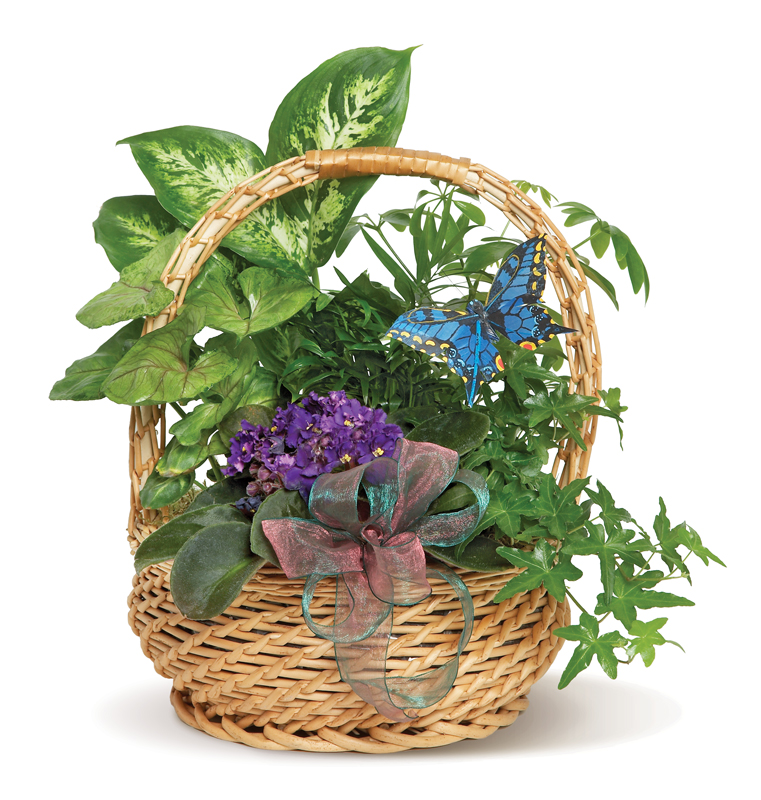 Today?s the day that your favorite office mate is having a birthday. What should you send? This verdant gift of assorted green and blooming plants in a woven basket is just perfect! A bright faux butterfly adds a whimsical touch.