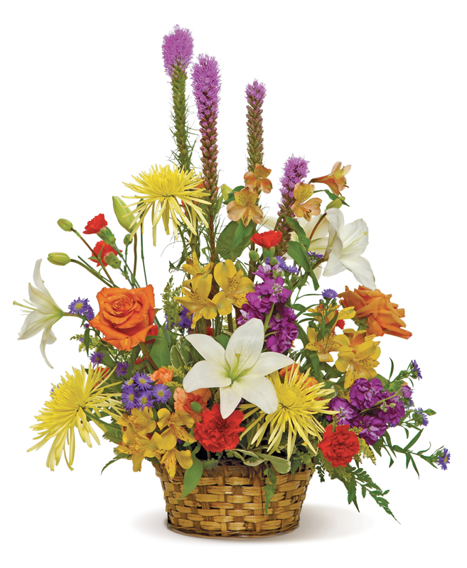 For a truly wonderful celebration- choose this big- bold and colorful flower arrangement of assorted blossoms- in complementary colors of yellow- white- orange- red and lavender. It?s like summertime in a basket!