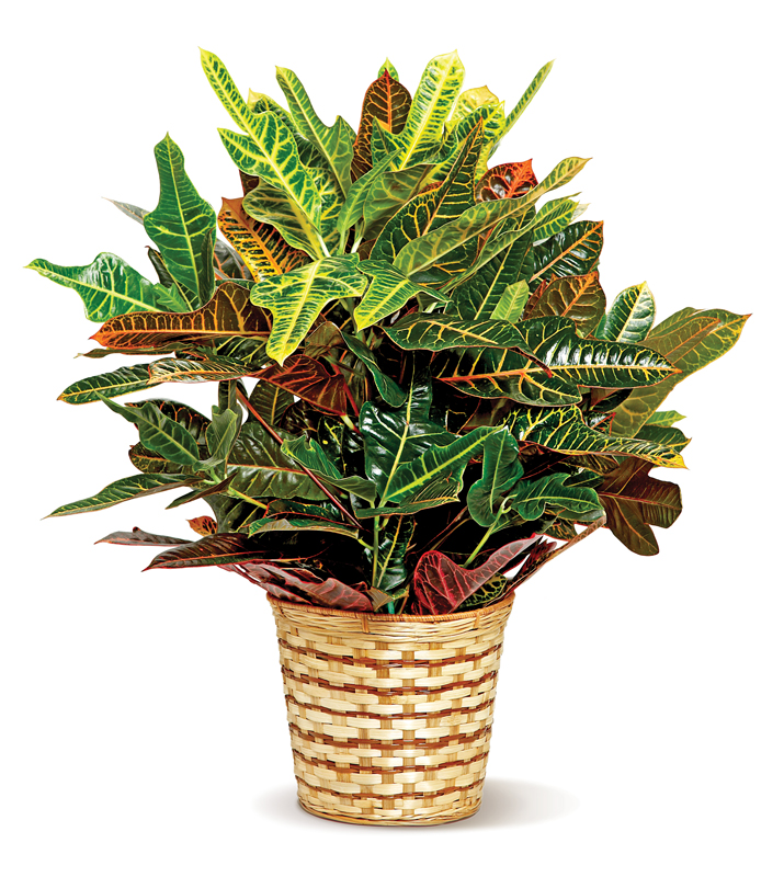 A potted croton plant is an eye-catching study in color. With its shiny leaves in vibrant shades of green- red- orange and yellow- this tropical houseplant will add a decorative touch to any room.