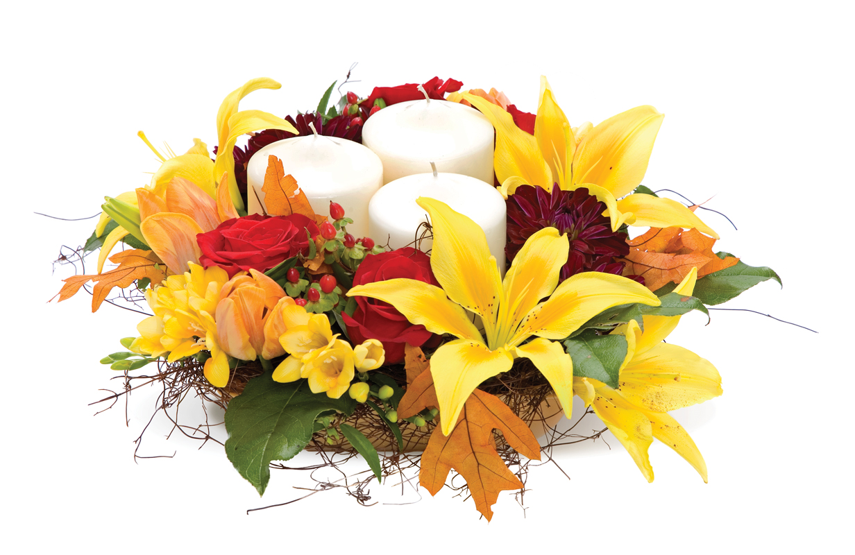Light up any fall feast with this appealing medley of fresh flowers such as Asiatic lilies- roses and more- arranged around three pillar candles. Accented with a sprinkling of autumn leaves- it?s a lovely way to perk up any dinner party.