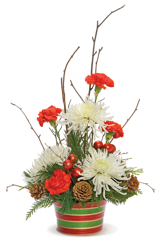 Bring back the nostalgia of the holiday season with this traditional 1-sided arrangement. Designed with red and white flowers- it is sure to deliver Holiday cheer to any home or office. Exact container may vary.