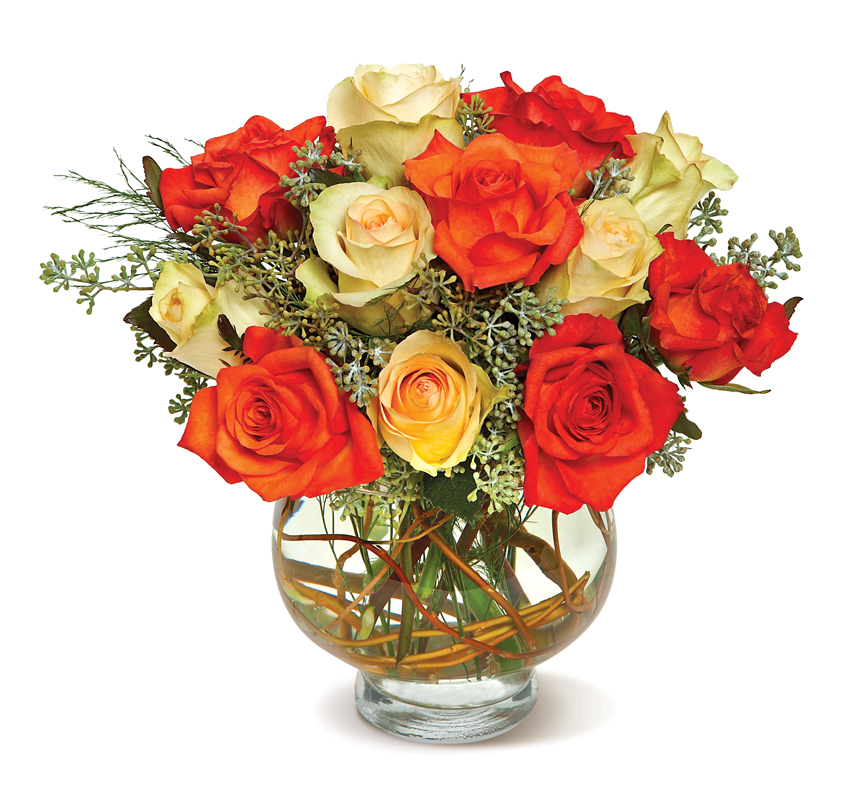 The harvest moon is round and orange-gold- and this rounded display of orange and pale yellow roses- accented with seeded eucalyptus and presented in a vase decorated with vines- is reminiscent of the prettiest full moon. A charming selection.
