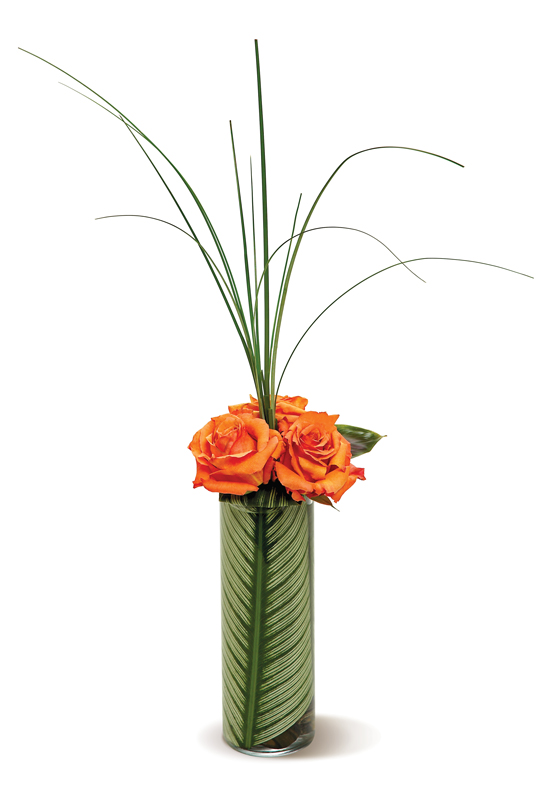 If you?re in the mood for something unique and beautiful- this artistic floral arrangement is sure to create an impression! Roses are tucked into a vase lined with decorative leaves- then topped with a spray of bear grass.