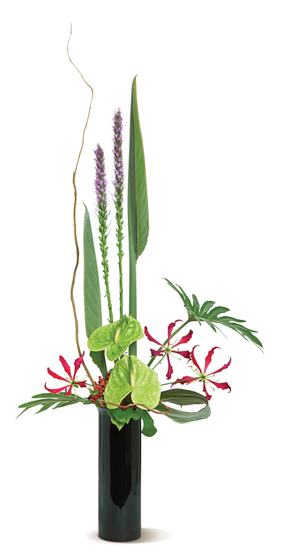 If you could pick the perfect floral arrangement for a modern home by the ocean- you might choose this stunning display of glossy green anthuriums- spiky red blossoms and more- arranged in a slender vase. A gorgeous gift for any day of the year.