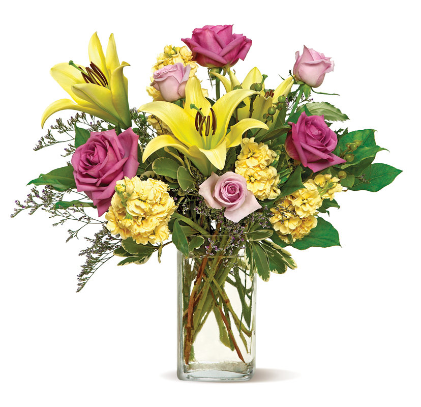 The sunny hues of daytime mingle with the dusky tones of night in this medley of yellow and purple blossoms that will be welcomed at any time- and for any occasion. A unique pairing of colors- and a stunning presentation.