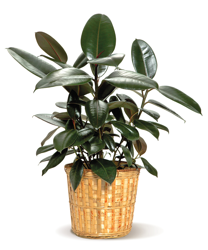 Hardy and decorative- a rubber tree plant is a pleasing addition to any room. With its large- glossy leaves- this living plant ? delivered in a woven basket ? will work well in an office or home- and is a welcome gift.