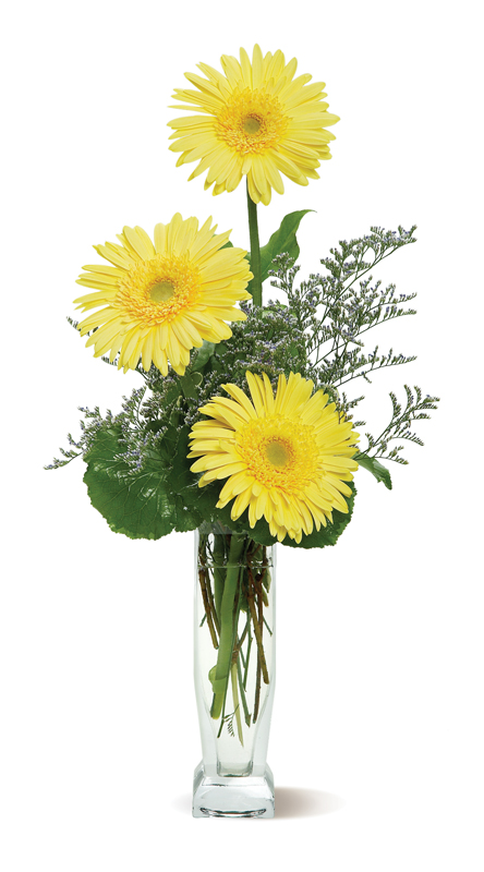 Three bright- pop art gerbera daisies in a vase- accented with greenery- create a cheerful floral display that?s a fun pick-me-up for any day of the week. A great ”thinking of you” gift for friends- family members or favorite co-workers.
