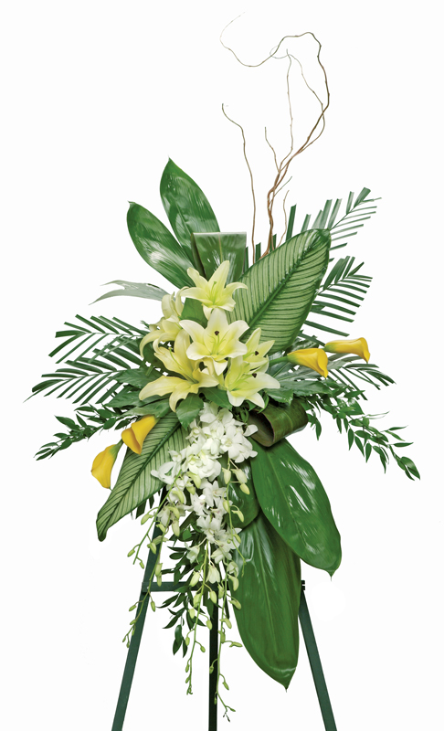 This standing spray ? created from a soothing display of yellow and white lilies and orchids- accented with glossy green leaves ? will express your thoughtfulness and consideration on a day of remembrance.