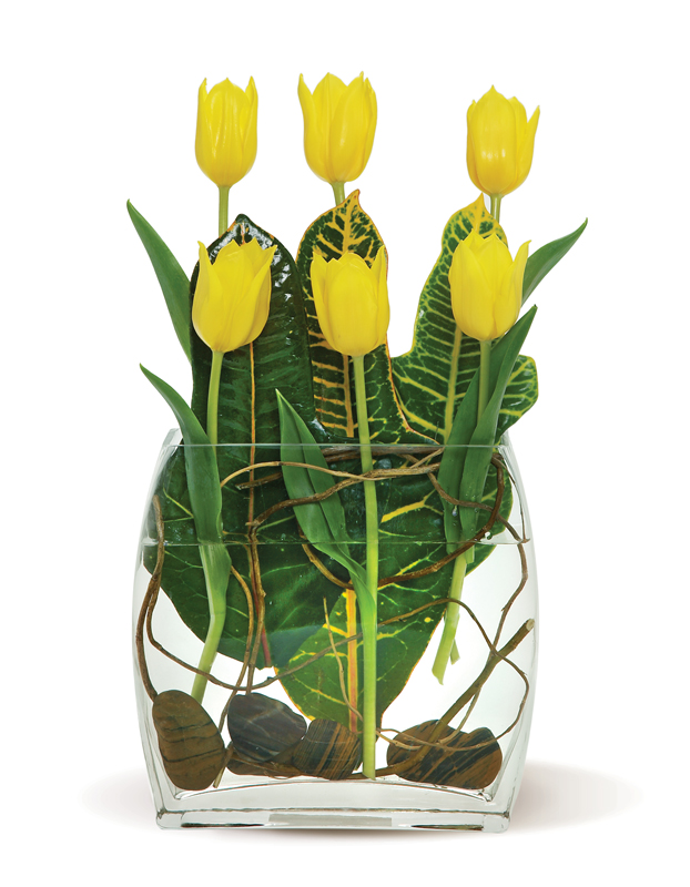 Six beautifully colorful spring tulips ? arranged in a geometric formation ? are set against a stark backdrop of leaves- rocks and vines in this unusual display with a chic- modern design. It?s a unique new twist on flower arranging- and a gift that will amaze and delight!