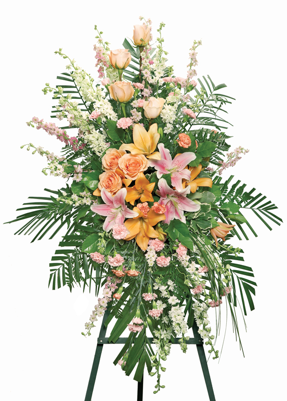 Share the spirit of hope and faith with a generous standing spray of pink and orange blossoms ? including lilies- roses and carnations ? against a backdrop of fresh palm fronds. A lovely way to express your sympathies.