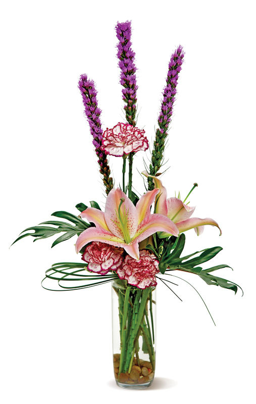 A slim- graphic arrangement of fresh flowers ? arranged in river rocks- and designed with an architectural flair ? is a lovely and modern display for any home or workplace. For a desk- a dining room or anything in between.