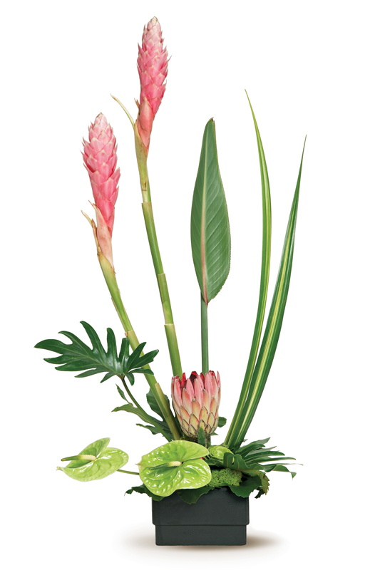 A long-lasting mix of exotic tropical elements ? including such beauties as ginger- protea and anthuriums ? stands tall and proud- and is reminiscent of a vacation on a South Sea island. A true floral treat!