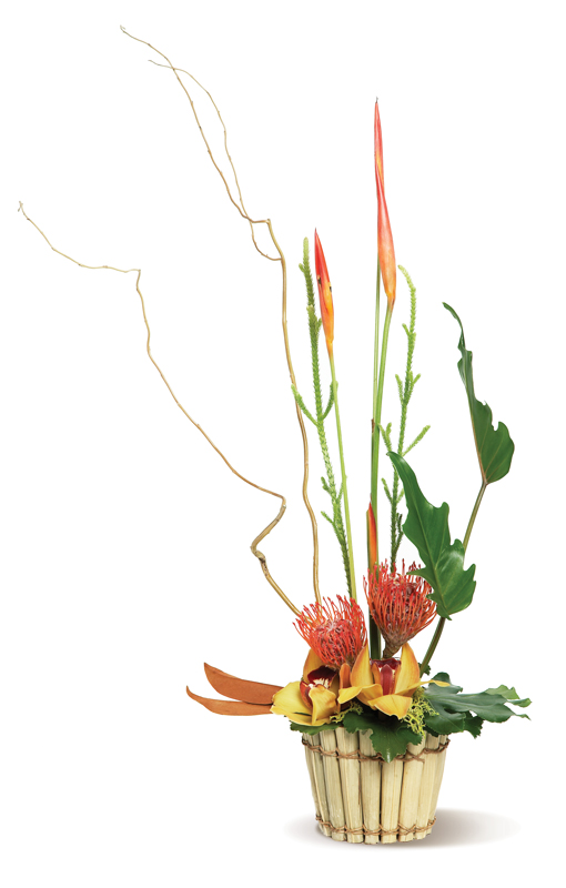 Dreaming of a vacation in the tropics? For an unusual gift ? or an interesting addition to a home or office ? choose this long-lasting tropical arrangement. A gathering of natural elements soars above a planter accented with a few orchid blooms. It?s exotic and unique.