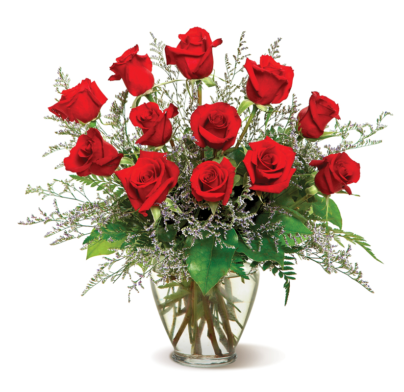 A charming bouquet of a dozen fresh and fragrant red roses- adorned with just a bit of greenery- is a classic Valentine?s Day gift. Delivered in a clear glass vase- this bouquet is also a romantic standard for any day of the year.